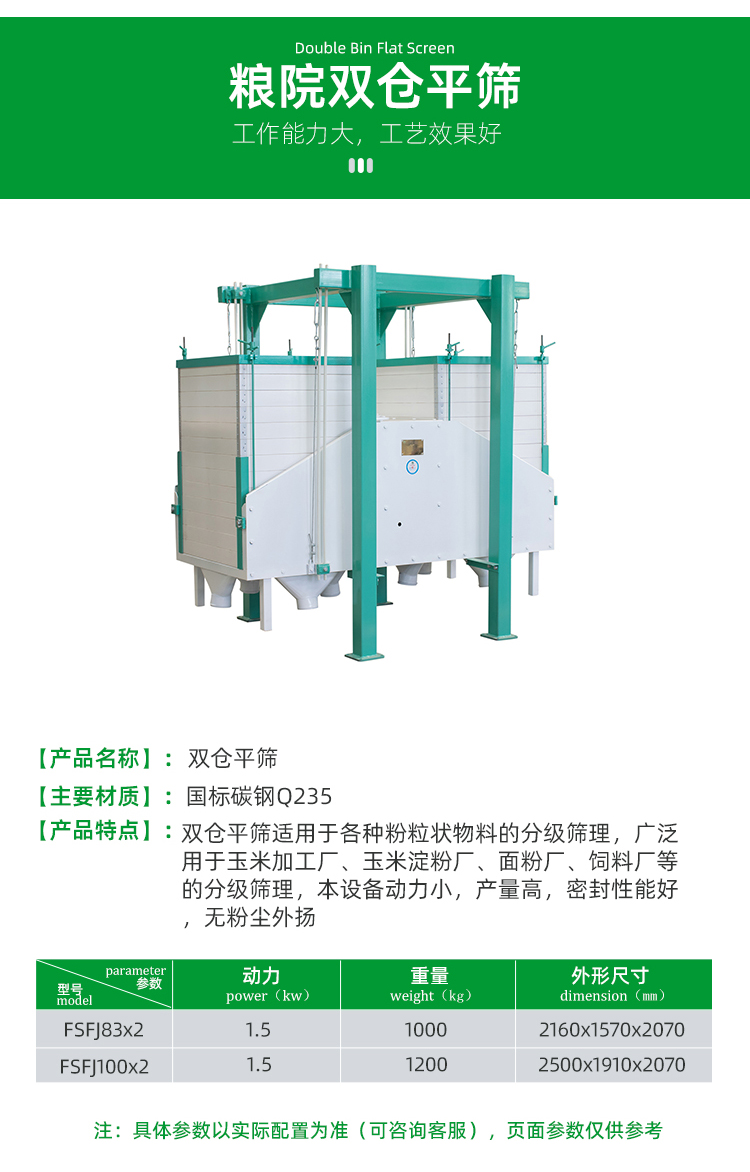 FSFS系列雙倉平篩適用于各種粉粒狀物料的分級篩理,廣泛用于玉米加工廠、玉米淀粉廠、面粉廠、飼料廠等的分級篩理;是非常理想的顆粒物料分級篩理設備。本設備動力小,產量高,密封性能好,無粉塵外揚。