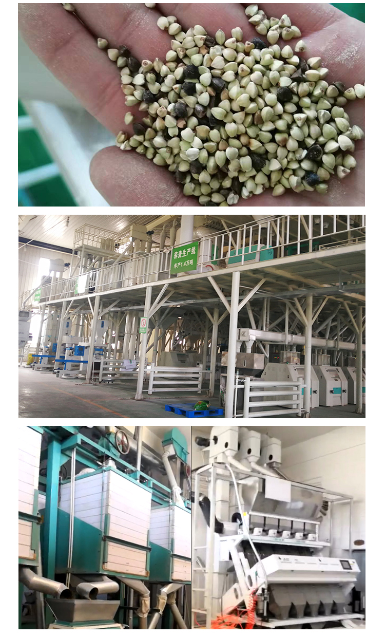 新型蕎麥加工設備的脫殼分選機組可對分級后的每個級別分別進行脫殼、除皮、一次未脫殼的子粒可自動返回脫殼機進行再次的脫殼。由于采用的是先分級后脫殼的方式,所以脫殼分選效果好、效率高、整米率高,且脫完的蕎麥殼是完整的。