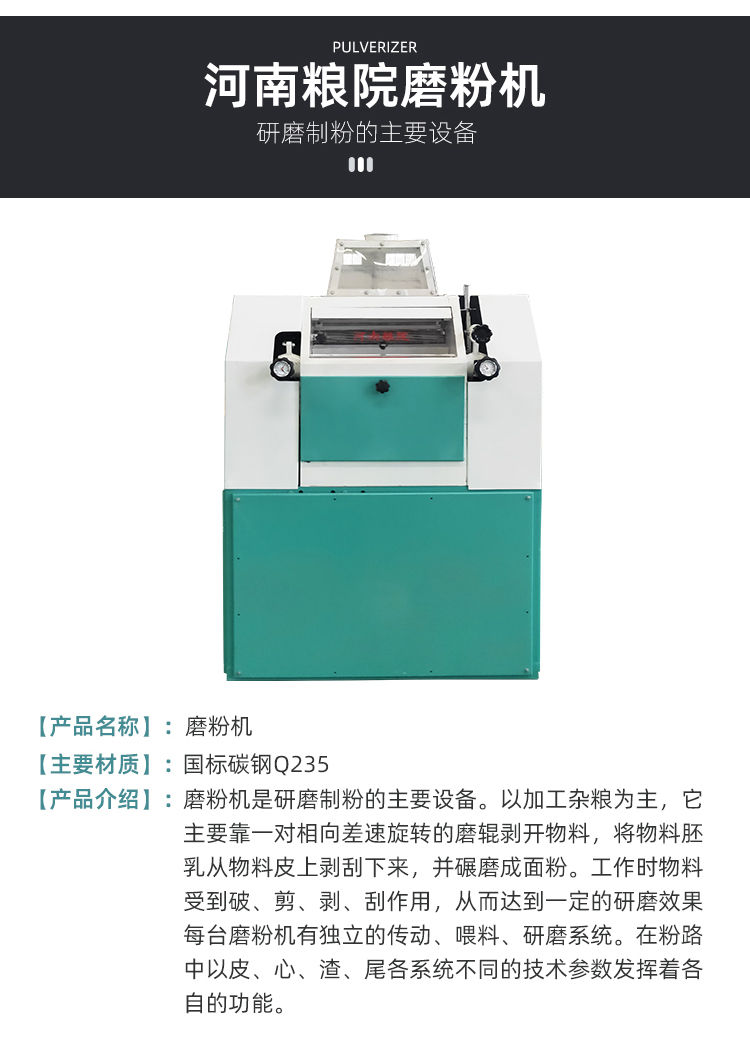 磨粉機(jī)是研磨制粉的主要設(shè)備。以加工雜糧為主,它主要靠一對(duì)相向差速旋轉(zhuǎn)的磨輥剝開物料,將物料胚乳從物料皮上剝刮下來,并碾磨成面粉。工作時(shí)物料受到破、剪、剝、刮作用,從而達(dá)到一定的研磨效果,每臺(tái)磨粉機(jī)有獨(dú)立的轉(zhuǎn)動(dòng)、喂料、研磨系統(tǒng)。在粉路中以皮、心、渣、尾各系統(tǒng)不同的技術(shù)參數(shù)發(fā)揮著各自的功能。
