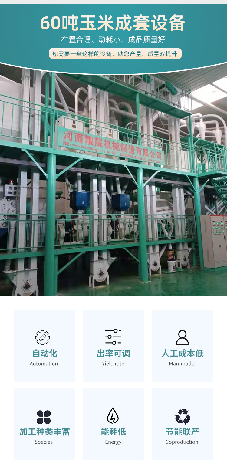 60噸級玉米加工設備通過對玉米的清理、去皮、破渣、分級、提胚、整粒、拋光、磨粉、平篩分級等一系列工藝,可同時生產出玉米胚、不同粒度的玉米粉,脫脂玉米粉等產品,來滿足不同用戶和食品加工業的需求。
