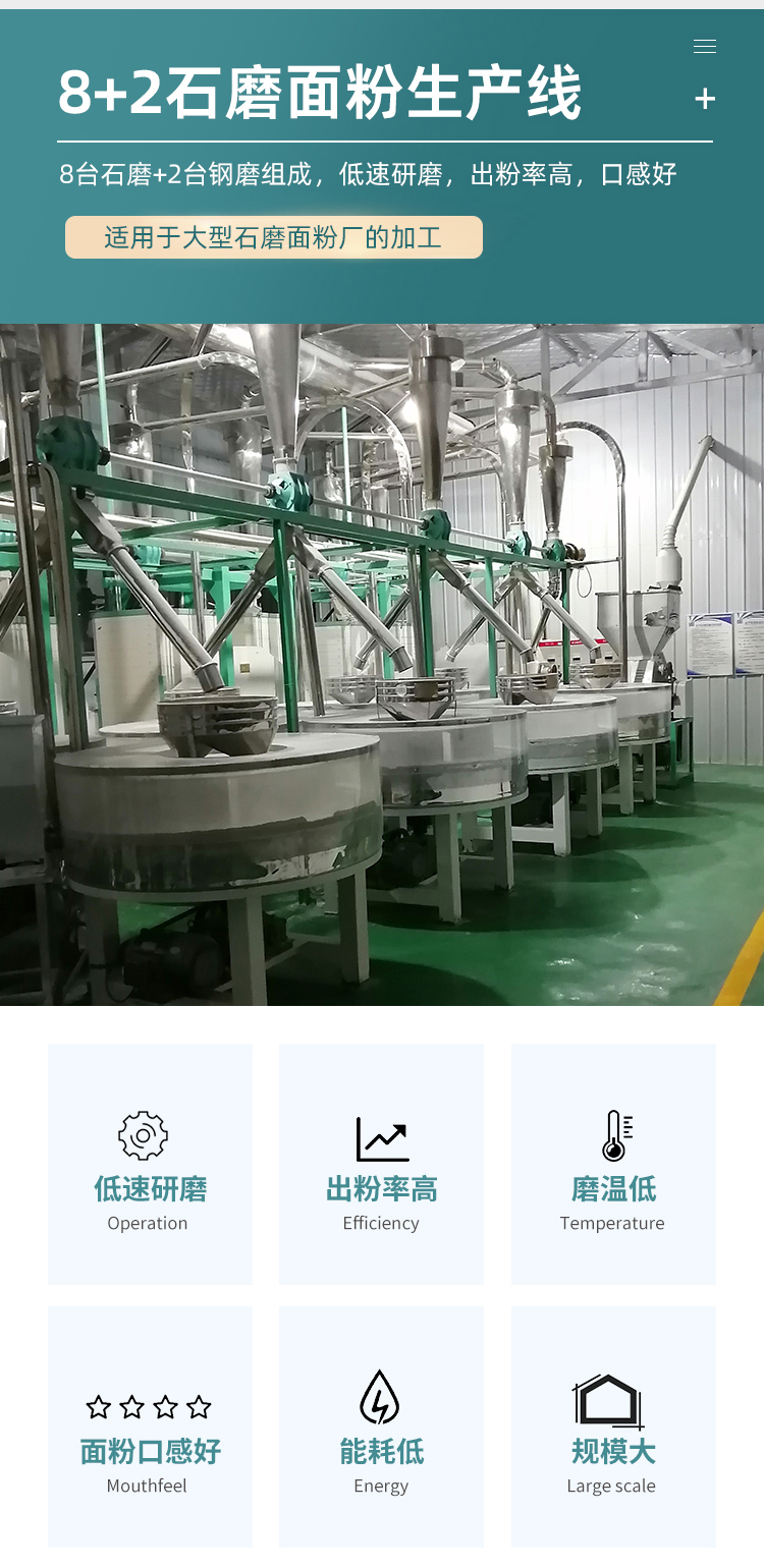 8+2石磨面粉加工成套設備轉速低、磨溫低,不會破壞小麥中的營養物質,改設備有效提高出粉率,適用于大型石磨面粉廠的加工,磨出來的面粉是天然面粉,不含任何添加劑,口感好,營養價值高,用石磨磨粉,能夠避免大型機械生產面粉時高溫高壓對面粉營養的破壞,從而更多地保留了面粉中的營養成分。