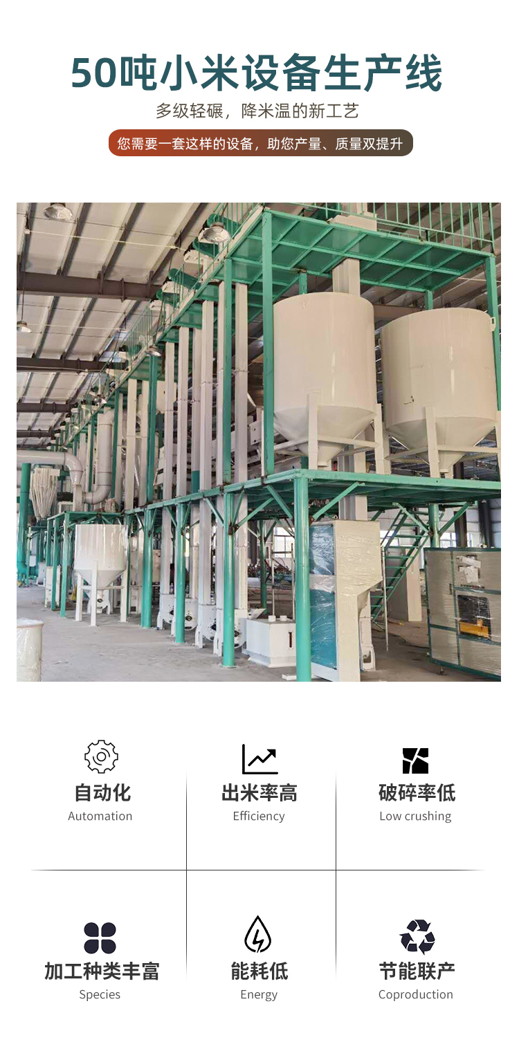 該生產設備可加工原糧有粳性小米、糯性小米、黃小米、白小米、綠小米、黑小米、高粱米及香小米。可出成品為系列小米、高粱米、飼料。產成品小米、高粱米的得率高、色澤好、無雜質,適應市場需求,為客戶創造高的經濟價值。整套產品工藝先進、設備精良、專用性強、布置合理、動耗小、出品率高、成品質量好,廣泛應用于食品加工企業和糧食加工企業。